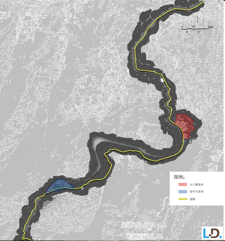 規劃用地范圍分為三部分:入口服務區、壺中天茶舍和貫穿全景區的道路。